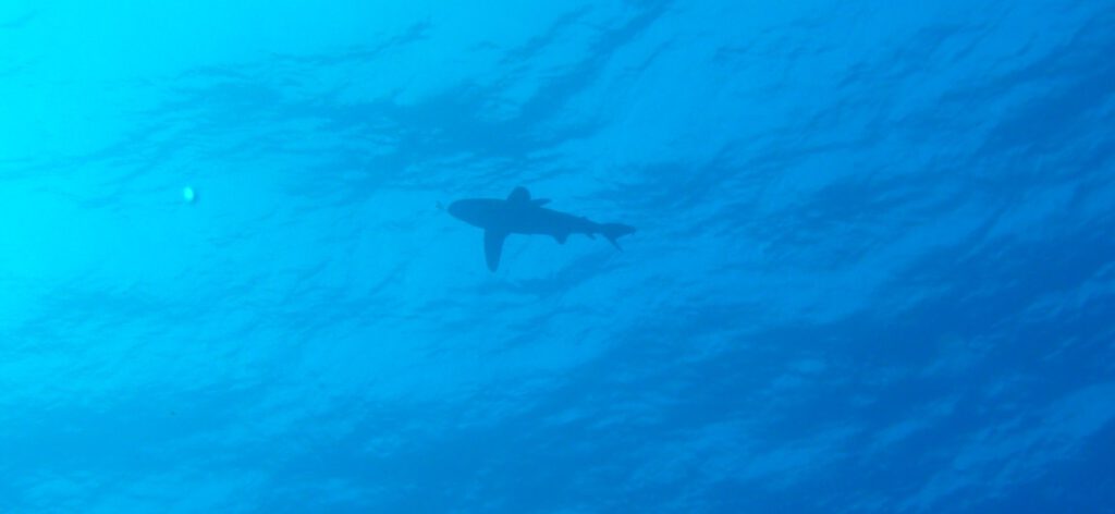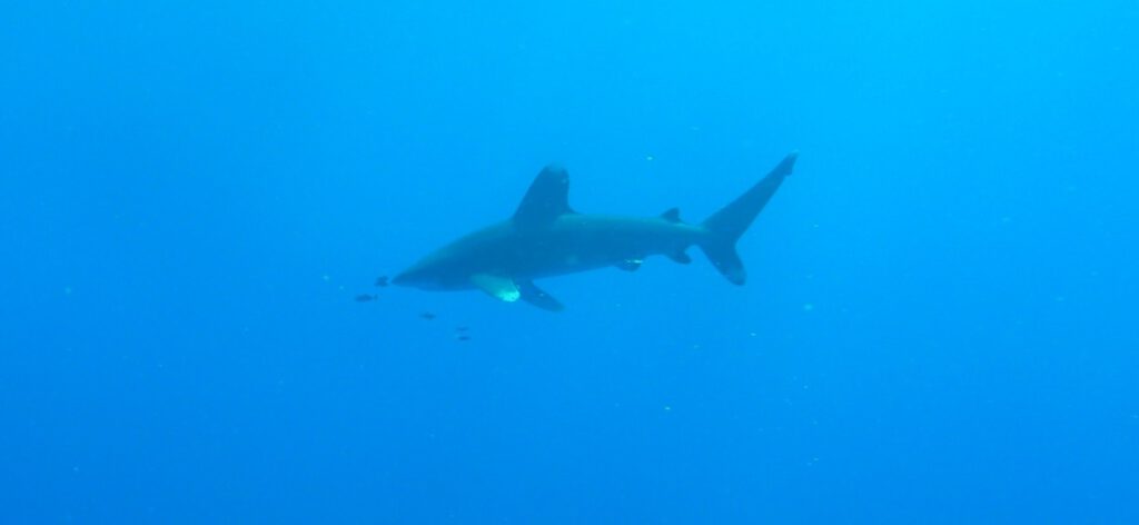 Der Tauchtag begann mit einem sehr ausführlichen Hai-Briefing hinsichtlich Verhalten und Sicherheit bei Haisichtungen. Dann ging es ins Wasser, zweimal am Big Brother und einmal am Small Brother. Was wir nur zu hoffen gewagt hatten, passierte: Wie aus dem Nichts erschienen immer wieder Haie – Weißspitzenhochseehaie (Longimanus) und Fuchshaie, immer wieder. 7 – 8 Tiere. Im Briefing noch belächelt, kamen einem unweigerlich die Verhaltensrichtlinien bei Hainäherungen wieder ins Gedächtnis. Trotz des erhabenen Anblicks führte die Annäherung eines sehr neugierigen Longimanus bei dem einen oder anderen zu dem Wunsch, er möge doch endlich abdrehen. Aber keiner von uns musste Gliedmaßen oder Ausrüstungsteile lassen – eine Erinnerung, an die man gerne mit leichter Ehrfurcht zurückdenkt.