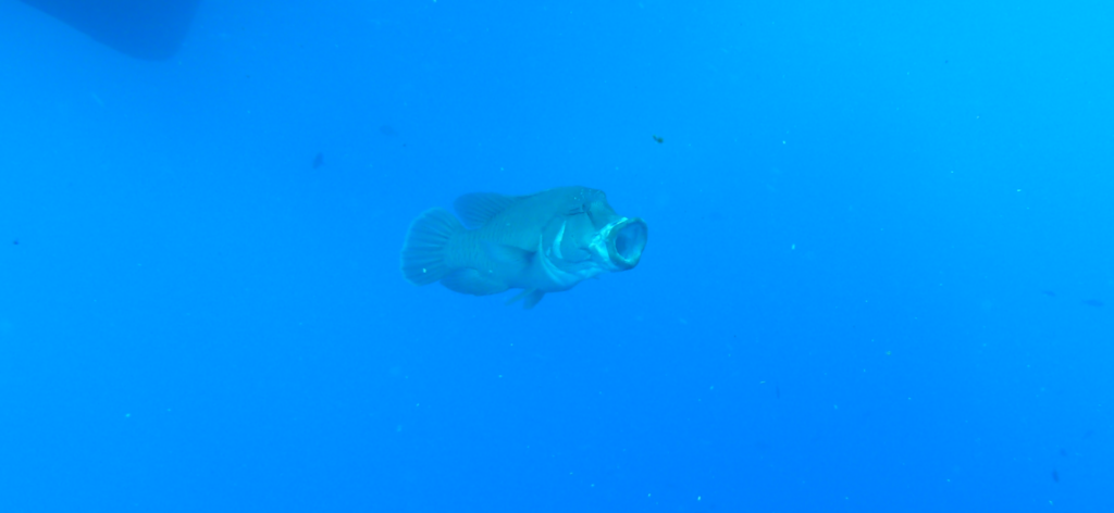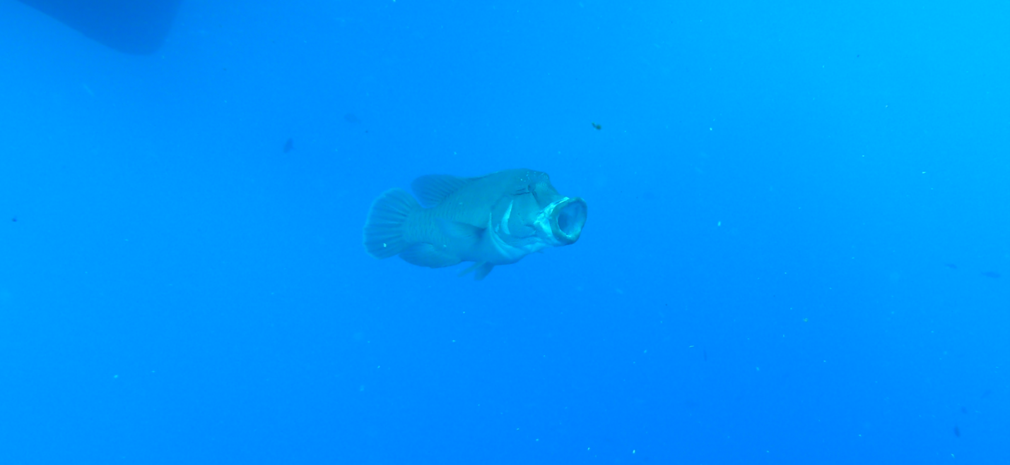Nächster Tauchspot war das Dunraven Wrack., was zwischen 16-22 Metern seine letzte Ruhe gefunden hat. Der dampfgetriebene Frachter mit Hilfsbesegelung war mit indischer Baumwolle, Gewürzen und Holz beladen, als er am 1876 auf ein Riffdach fuhr. Zum Verhängnis wurde der Dunraven ein Schwelbrand unter Deck, der das Schiff 12 Stunden später sinken ließ. Eine schwimmende Muräne und ein Napoleon machten uns hier ihre Aufwartung.