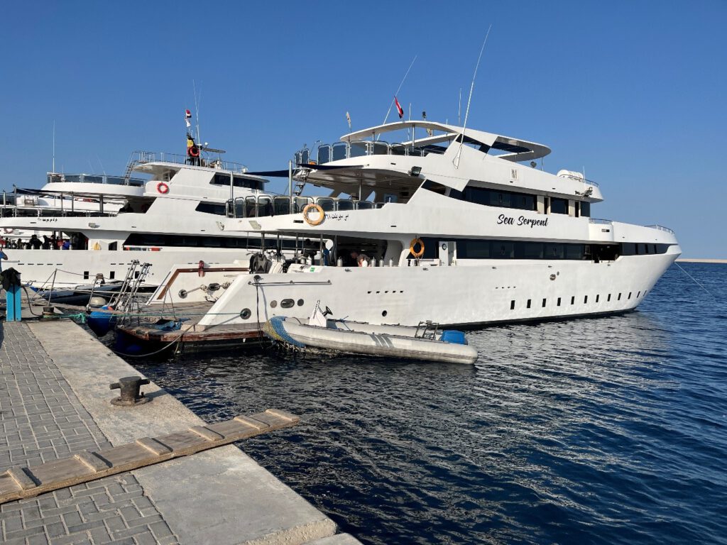 Gute 4 Stunden Flug später wurden wir sofort zum Transferbus geleitet und auf unser Schiff, die Sea Serpent, im Hafen von Hurghada chauffiert. Dort konnten wir gleich unsere Doppelkabinen am Oberdeck beziehen.